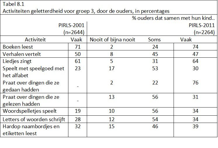 Om meer inzicht te krijgen over de invloeden van de ouders heeft PIRLS, Progress in International Reading Literacy Study, een internationaal vergelijkend onderzoek naar de vaardigheid in begrijpend lezen bij basisschoolkinderen gedaan. Dit hebben zij gedaan door een oudervragenlijst te maken. Die is door 55% van de Nederlandse ouders ingevuld. Aan de ouders is de vraag gesteld welke activiteiten zij samen met hun kind doen en hoe vaak zij dit doen. In onderstaande tabel kun je zien dat veel ouders vaak aandacht besteden aan activiteiten die de geletterdheid stimuleren.